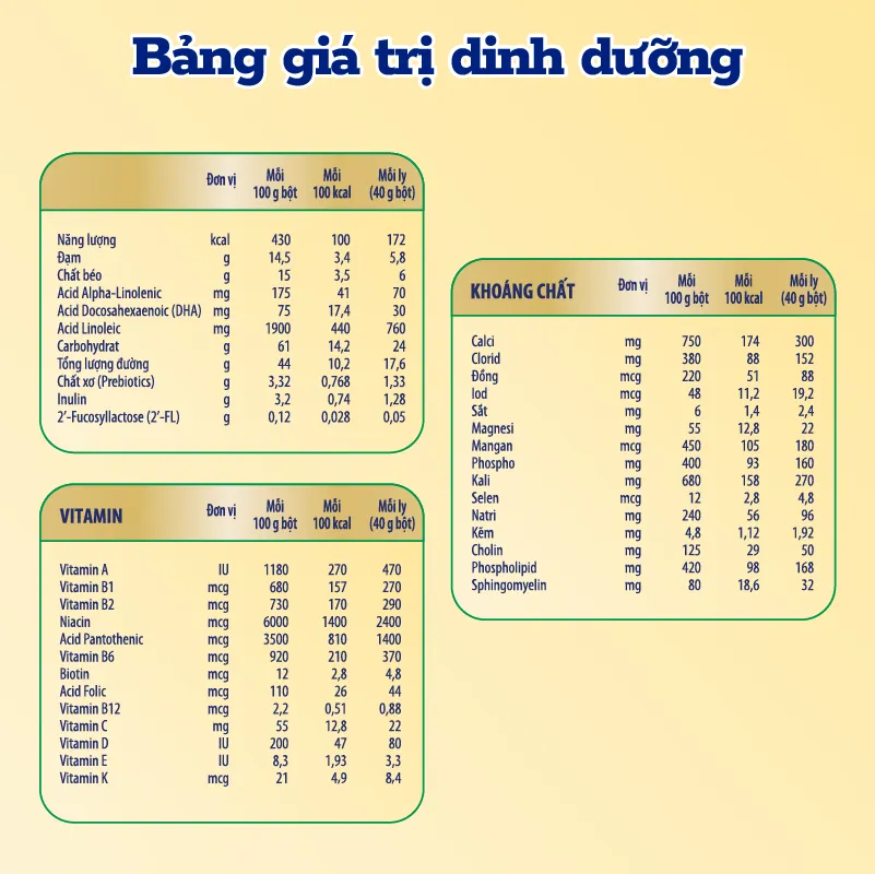 Bột bơ sữa (nguồn của MFGM; 35,4%), lactose, dầu thực vật, maltodextrin, đạm whey tinh chất, sữa bột tách béo, inulin, các khoáng chất (calci carbonat, calci phosphat dibasic, magnesi phosphat, tricalci phosphat, natri citrat, kali bicarbonat, kali citrat, calci clorid, magnesi clorid, calci hydroxyd, sắt sulphat, kali clorid, kẽm sulphat, kali hydroxyd, mangan sulphat, đồng sulphat, kali iodid, natri selenit và natri iodid), dầu cá là nguồn của acid Docosahexaenoic (DHA), hương liệu tổng hợp (hương vani), các vitamin (cholin bitartrat, natri ascorbat, cholin clorid, alpha-tocopheryl acetat, niacinamid, retinyl palmitat, calci pantothenat, acid ascorbic, cholecalciferol, phytonadion, cyanocobalamin, thiamin hydroclorid, pyridoxin hydroclorid, riboflavin, acid folic và biotin), chất nhũ hóa (lecithin đậu nành), 2’-fucosyllactose, sirô mật bắp và chất chống oxy hóa (ascorbyl palmitat).