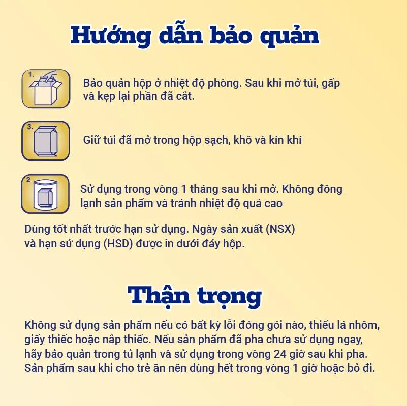 Dùng muỗng có trong lon để đong bột. Bảo quản muỗng KHÔ RÁO trong lon.